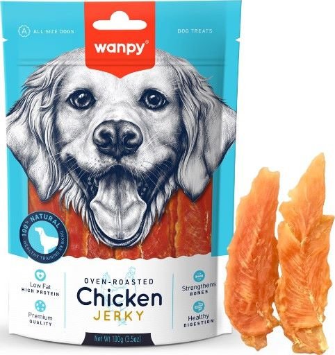 - Wanpy Oven-Roasted Chicken Jerky for Dogs (100g) is a delicious, high-protein treat made from premium chicken breast to support your dog’s overall health and vitality.