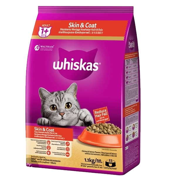 Whiskas 1+ Adult Dry Cat Food Skin & Coat-Chicken & Salmon Flavour (1.1kg)