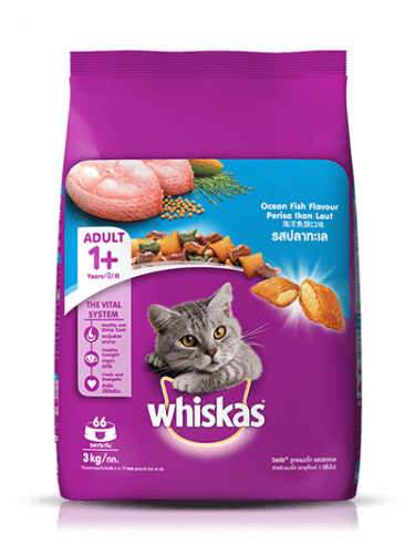 Whiskas 1+ Dry Cat Food ‑ Ocean Fish Flavour is a complete and balanced adult dry cat food specially formulated for cats aged 1 year and above. Made with tasty ocean fish flavour and essential nutrients, it provides 100 % of your cat’s daily nutritional needs to support overall health and vitality. This crunchy kibble is enriched with vitamins, minerals, omega‑6 and zinc for a healthy skin and shiny coat, plus prebiotics to support digestion and antioxidants to help maintain a strong immune system. With vitamin A and taurine included, it also helps support healthy eyesight and energy levels for active adult cats. (whiskas.me)